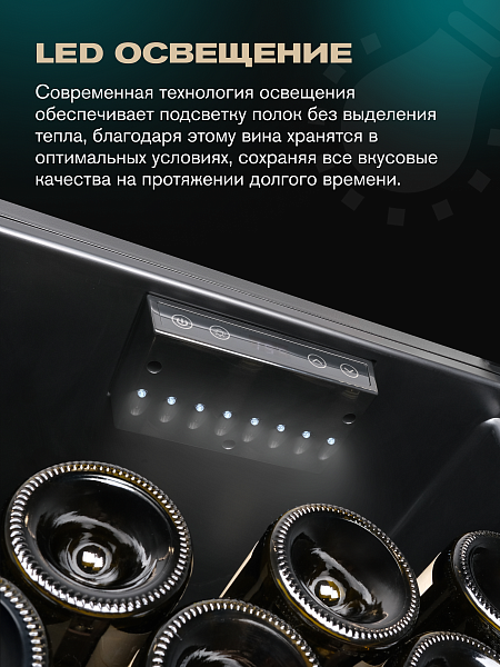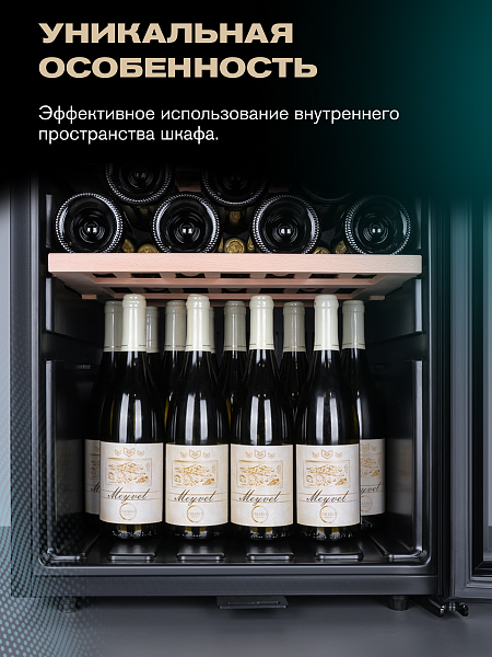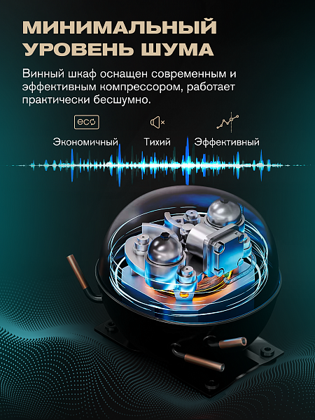 Винный шкаф работает очень тихо — уровень шума не превышает 38 дБ. Вы будете наслаждаться любимыми напитками без посторонних назойливых звуков.
