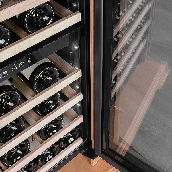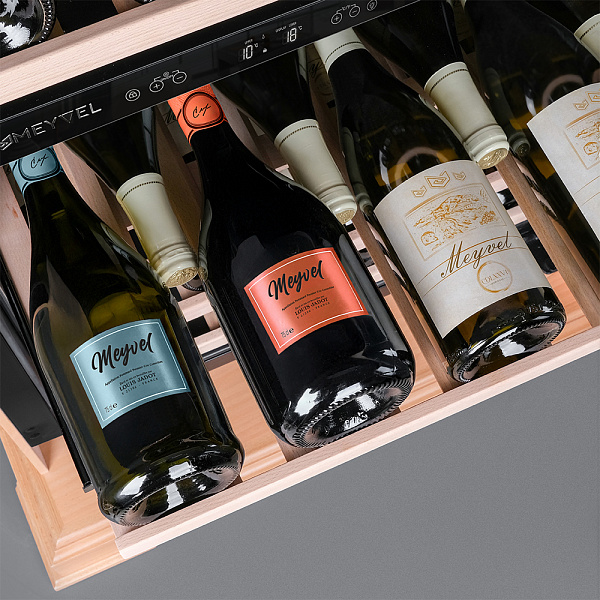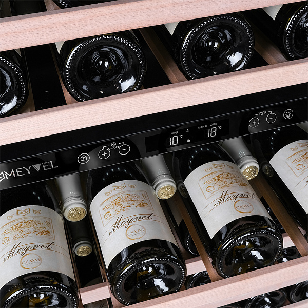 Компрессорный винный шкаф Meyvel MV46PRO-KBT2 (Натуральный бук) обладает большой вместимостью и даёт возможность разместить до 46 бутылок стандартного типа Бордо (0,75 л). Располагаются они на выкатных полках из дерева. Внутреннее пространство шкафа разделено на 2 температурные зоны, с возможностью настраивать каждую из них. Диапазон верхней зоны варьируется от +5°C до +12°C, а нижней - от +12°C до +20°C.