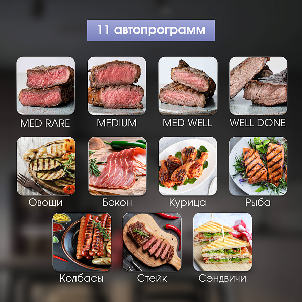 Гриль Grillmeister ZEG-934 – это инновационный прибор с сенсорным управление и 7 автоматическими программами. Вы выбираете только вид продукта (программу), а температура и время приготовления выставляется автоматически.