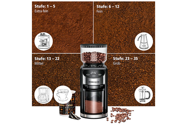 Регулировка степени помола (35 шагов), от мелкого (эспрессо) до грубого (френч-пресс)