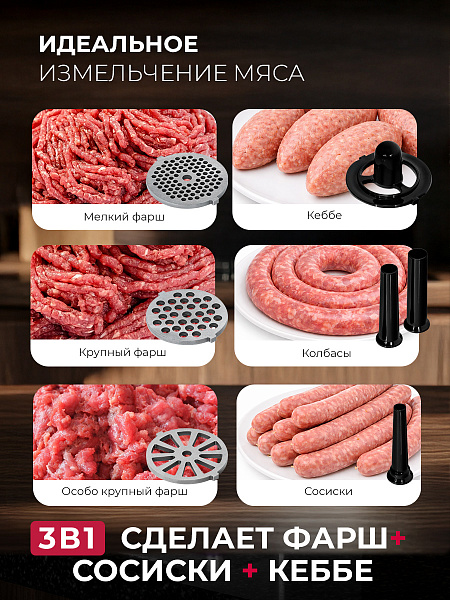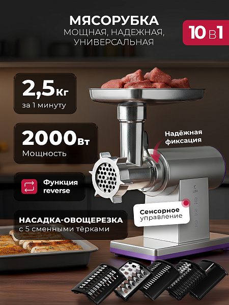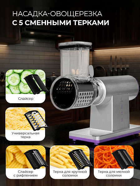 Главное отличие серии PRO – расширенная комплектация. В дополнение к трём металлическим дискам для помола (мелкий, средний и крупный) и насадкам для колбасок и кеббе, мясорубка оснащена овощерезкой-слайсером. В комплект входят пять барабанов: для крупной и мелкой соломки, универсальная тёрка, гладкий и рифлёный слайсеры. Такая конфигурация делает устройство универсальным помощником для приготовления салатов, гарниров, тертых овощей и фруктов. Все элементы легко фиксируются и снимаются, что упрощает обслуживание и замену насадок.