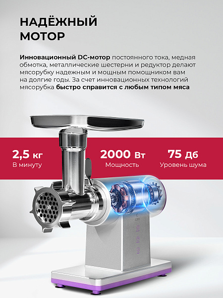Мясорубка снабжена встроенной защитой от перегрева, автоматически отключающей питание при повышенной температуре двигателя. Функция реверса предотвращает перегрузку шнека и помогает избежать остановки при обработке плотных ингредиентов. Прорезиненные опоры обеспечивают устойчивое положение устройства во время работы. Конструкция корпуса изготовлена из термостойких материалов, а система вентиляции обеспечивает эффективное охлаждение мотора.