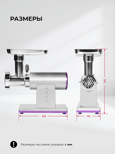 Прибор сочетает в себе функции мясорубки и овощерезки, что позволяет экономить место на кухне и сокращает количество бытовой техники. Габариты устройства составляют 355 × 135 × 355 мм. Рабочий уровень шума комфортен для домашнего использования – до 75 дБ. Все съёмные элементы устойчивы к износу и легко очищаются вручную или в посудомоечной машине.