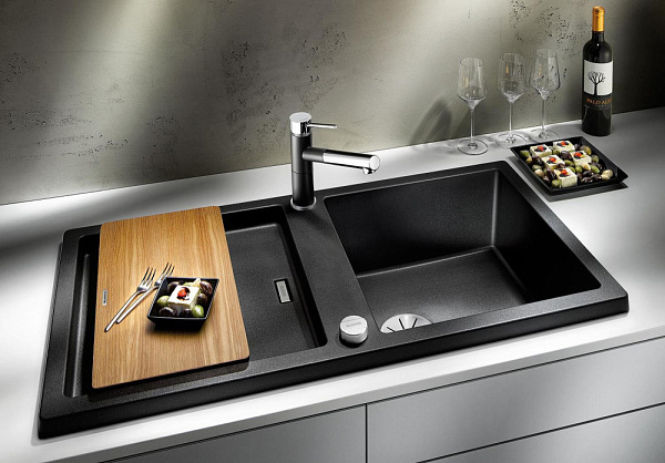 Уменьшенная ширина мойки увеличивает пространство за мойкой Рекомендованный смеситель BLANCO ALTA-S Compact Мойка оборачиваемая Размеры 980 x 480 x 190 mm Установка накладная Ширина шкафа 60 см Комплектация: многослойная разделочная доска из пластика и древесины ясеня, отводная арматура с клапаном-автоматом 3 ½"