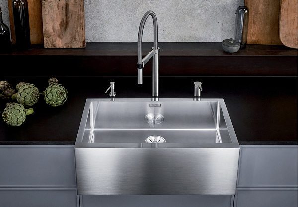 Cronos XL 8-IF - большая прямоугольная кухонная мойка из высококлассной нержавеющей стали от немецкого завода SteelArt Blanco. Эксклюзивное качество и индивидуальное исполнение. Высота передней части (фасада) мойки регулируется индивидуально: минимум 201 мм, максимум 291 мм. Мойка Blanco Cronos XL 8-IF идеально подойдет для кухни в индустриальном стиле, стиле лофт или минимал. Эта мойка притягивает к себе взгляды благодаря необычной конструкции и дизайну: сочетание классической формы большой раковины и современного исполнения в строгой и элегантной нержавеющей стали. Конструкция с широким выступающим фасадом мойки придает ей уникальный, немного брутальный и стильный внешний