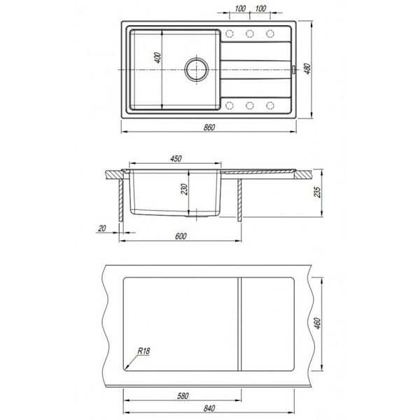 Готовых отверстий для смесителя Нет