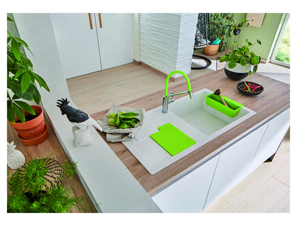 В комплектацию входит практичный набор аксессуаров одного из четырех ярких цветов: лимон, киви, апельсин или лава. Многофункциональная гибкая разделочная доска SITYPad идеально дополняет линии крыла мойки, в то время как коландер SITYBox станет элегантным местом для хранения принадлежностей для