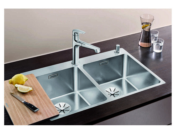Две чаши большого объема легко очищаются от загрязнений благодаря закругленным углам. Клапан-автомат — одно их преимуществ модели. Элегантные дополнительные аксессуары повышают функциональность мойки.