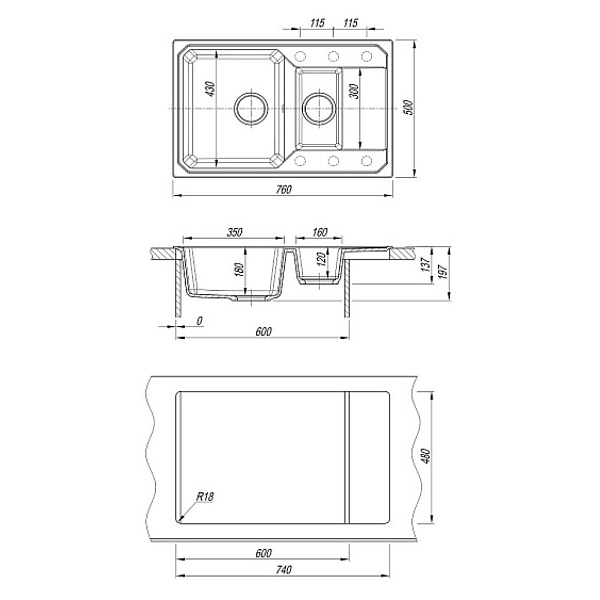 Размеры мойки — 760×500 мм. Она оснащена одной глубокой чашей и удобным крылом, которое можно использовать как зону для сушки или подготовки продуктов. Возможность установки как врезным, так и накладным способом делает модель универсальной и подходящей для разных типов кухонных гарнитуров.