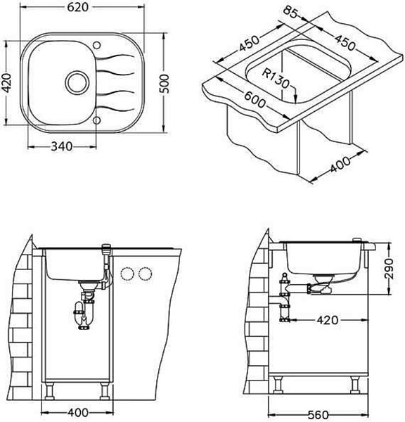 Отсутствие проделанных заранее отверстий в мойке делают ее более универсальной. Вы можете установить смеситель, дозатор, кран ля питьевой воды именно там, где Вам это удобно. Сделать отверстие в мойке можно с помощью обычного домашнего инструмента, и не требует профессиональных навыков.