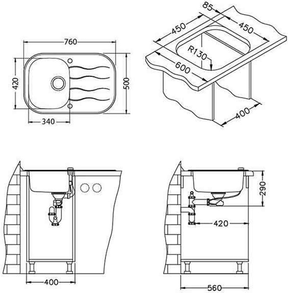 Отсутствие проделанных заранее отверстий в мойке делают ее более универсальной. Вы можете установить смеситель, дозатор, кран ля питьевой воды именно там, где Вам это удобно. Сделать отверстие в мойке можно с помощью обычного домашнего инструмента, и не требует профессиональных навыков.