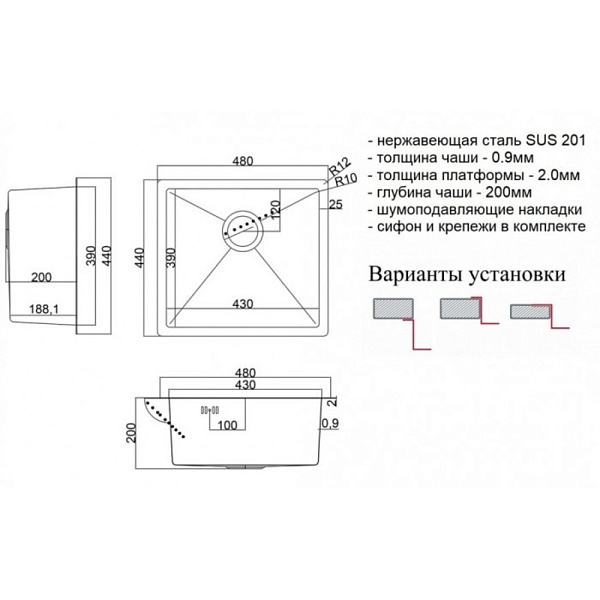 Чаша мойки выполнена из нержавеющей стали толщиной 0.9 мм, а кант толщиной 2 мм, что позволяет мойке минимально возвышаться над столешницей.