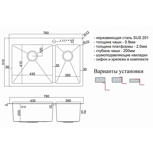 Чаша мойки выполнена из нержавеющей стали толщиной 0.9 мм, а кант толщиной 2 мм, что позволяет мойке минимально возвышаться над столешницей.