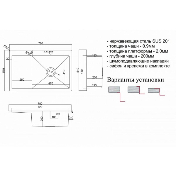 Чаша мойки выполнена из нержавеющей стали толщиной 0.9 мм, а кант толщиной 2 мм, что позволяет мойке минимально возвышаться над столешницей.