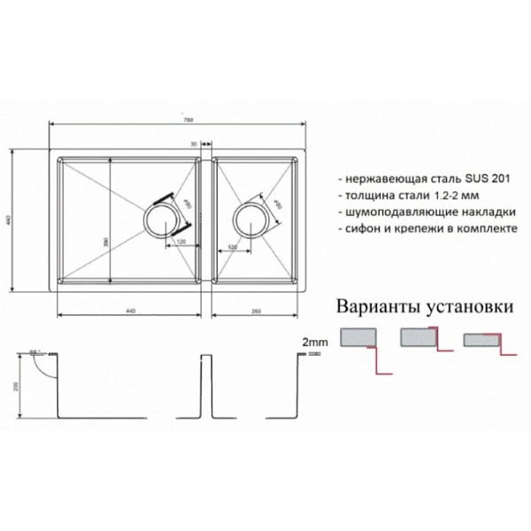 Размер чаш: 440 x 390 / 260 х 390 мм