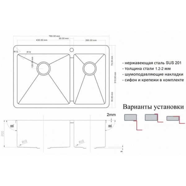 Размер чаши: 430 х 410/ 260 х 410 мм