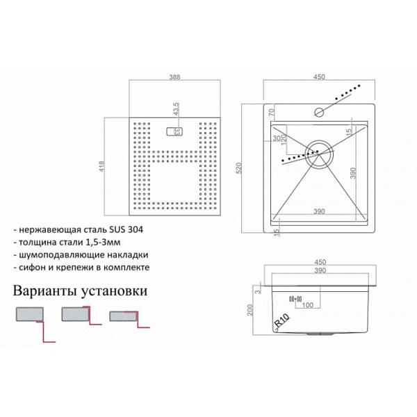 отводная арматура 3½", крепежи и сифон, с закруглёными углами, крышка из нержавеющей стали