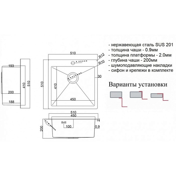 Чаша мойки выполнена из нержавеющей стали толщиной 0.9 мм, а кант толщиной 2 мм, что позволяет мойке минимально возвышаться над столешницей.