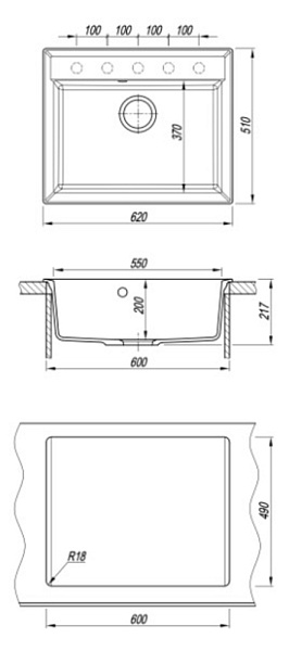 Описание Квадратная мойка с большой чашей для кухонного шкафа 60 см
