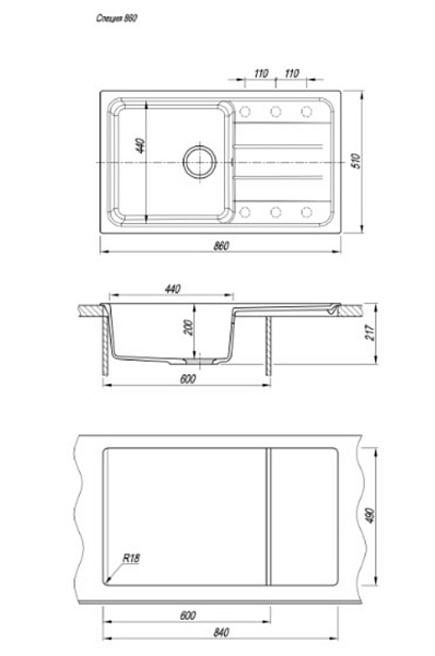 Описание Прямоугольная мойка с большой чашей для кухонного шкафа 60 см