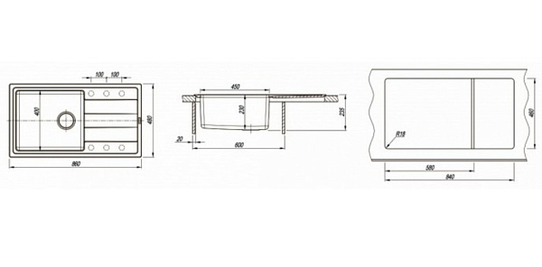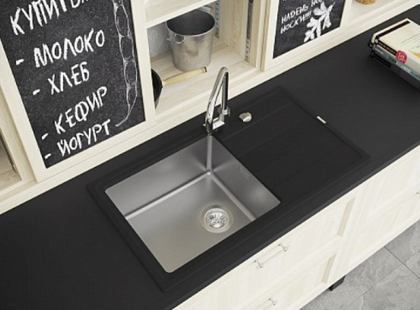 Чаша выполнена из нержавеющей стали марки AISI 304, толщина металла 1 мм., материал столешницы искусственный камень (композитный материал).