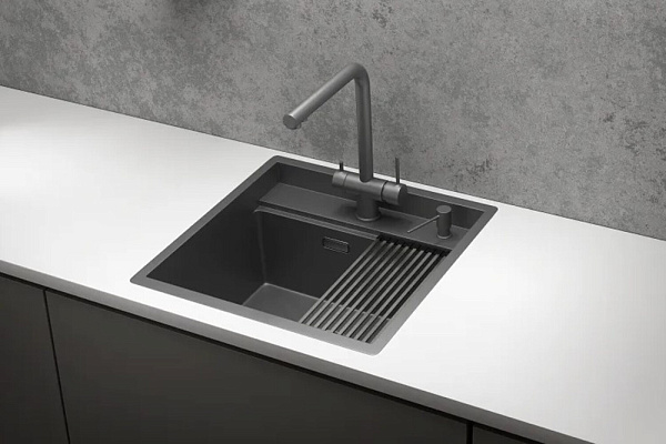 - Дозатор и ролл-мат для удобного хранения моющих средств и губок, что обеспечивает гигиеничность и порядок на кухне;
