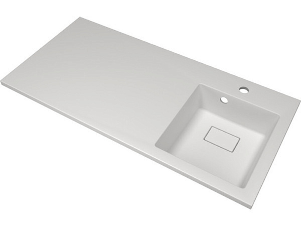 Раковина представляет единую литую поверхность, которая состоит из чаши и широкой столешницы. В зависимости от дизайн-решения ванной комнаты под столешницей можно разместить стиральную машину или мебельную тумбу.