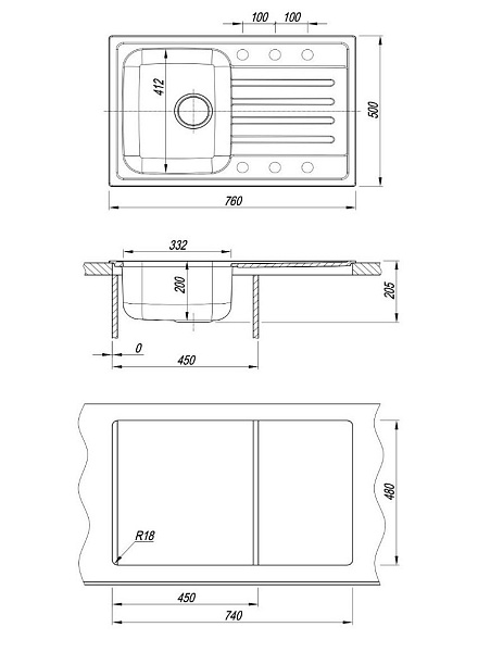 Материал чаши мойки - нержавеющая сталь марки AISI 304, толщина 0,8 мм