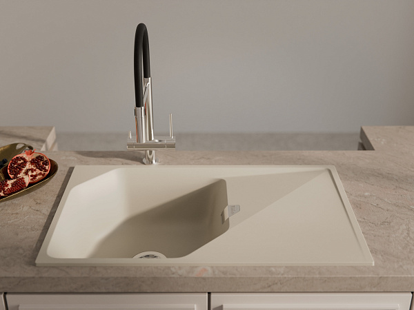 Модель отличается ярким дизайном и функциональностью. У неё есть панель перелива оригинального дизайна, глубокая чаша и просторное крыло для сушки посуды и столовых приборов. Форма мойки — прямоугольная с крылом, материал — Terigranit. Размер чаши составляет 470 х 460 х 200 мм, а общий размер — 850 х 500 мм. Способ монтажа — классический врезной, установочный проём — 830 х 480 мм. 4 5 6