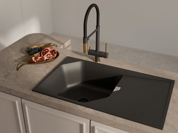 Модель отличается ярким дизайном и функциональностью. У неё есть панель перелива оригинального дизайна, глубокая чаша и просторное крыло для сушки посуды и столовых приборов. Форма мойки — прямоугольная с крылом, материал — Terigranit. Размер чаши составляет 470 х 460 х 200 мм, а общий размер — 850 х 500 мм. Способ монтажа — классический врезной, установочный проём — 830 х 480 мм. 4 5 6