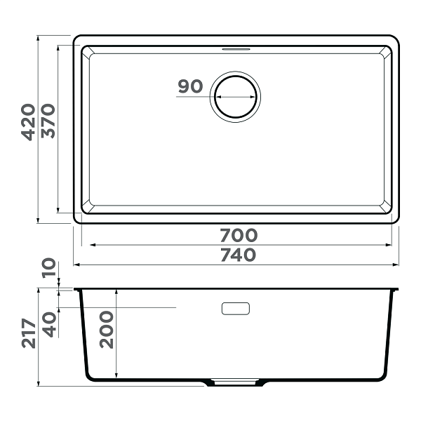 Размеры — 74 × 42 см, глубина чаши — 20 см: просторный объём для удобного мытья крупной посуды. Монтаж подстольный, одна чаша без крыла. Донный клапан-автомат приобретается отдельно по желанию. Комплект включает крепления и сифон.