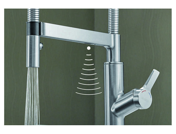 Широкий диапазон действия. Расположение датчика выбрано оптимально: он установлен на ручке-держателе излива, что позволяет ему поворачиваться вместе с ним на угол до 140º. Вращающийся датчик обеспечивает доступ к функции «старт-стоп».