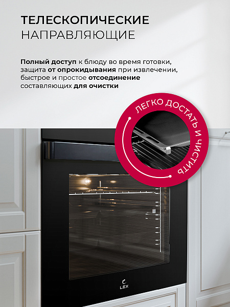 Хромированные телескопические направляющие — удобство и безопасность с первого использования Духовой шкаф LEX EDP 607 Wide Series оснащен хромированными телескопическими направляющими, которые обеспечивают легкий доступ к блюдам во время приготовления. Благодаря им вы можете безопасно и удобно извлекать противни, снижая риск ожогов и делая процесс готовки более комфортным.
