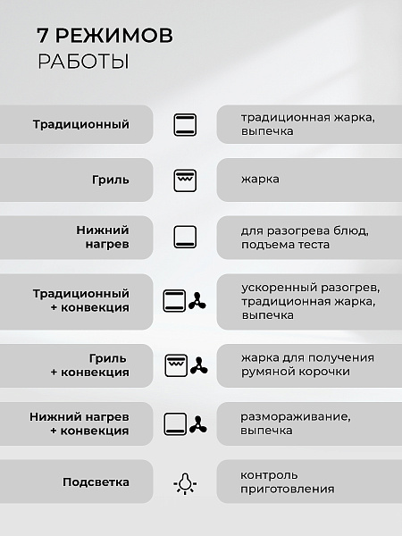 Если же в духовом шкафу есть функция СВЧ и пароварки, количество режимов увеличится и расширит ваши возможности в приготовлении вкусной и здоровой еды.