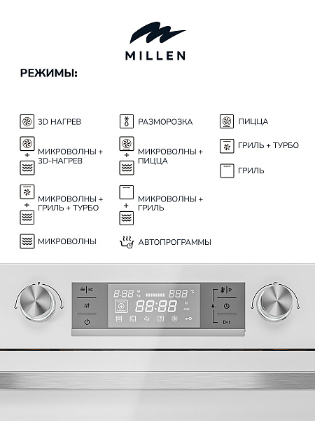 11 режимов нагрева позволят подобрать идеальный сценарий для приготовления вашего блюда. В режиме «Авто программы» можно выбрать одну из 13 уже готовых настроек, задав тип приготовления и необходимый вес. Есть два режима разморозки. Для более сложных блюд предусмотрены другие программы, позволяющие настроить работу духового шкафа под конкретные задачи, например равномерное поджаривание стейка, запекание рыбы, приготовление на гриле. Опция 3D нагрева идеальна для любой выпечки, тортов и пиццы.