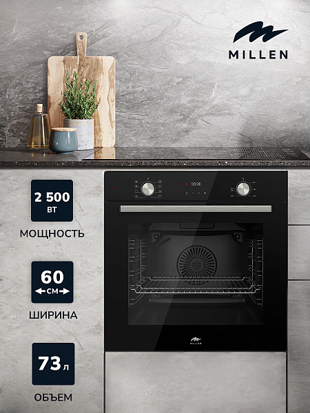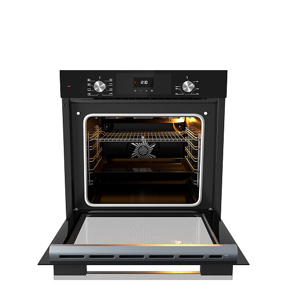 Отслеживать время приготовления удобно с помощью встроенного LED-дисплея, расположенного в центре панели управления. Быстрая корректировка параметров возможна при использовании четырех сенсорных клавиш внизу дисплея. Пользователю доступно множество программ приготовления, включая стандартный режим, верхний и нижний нагрев, большой или малый гриль. Эффективную работу конвекции обеспечивает мощный вентилятор. Постоянная циркуляция горячего воздуха позволяет равномерно пропечь любое блюдо.