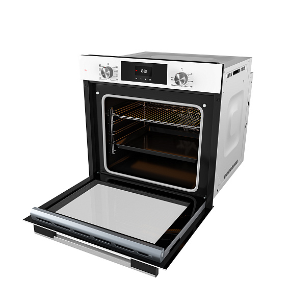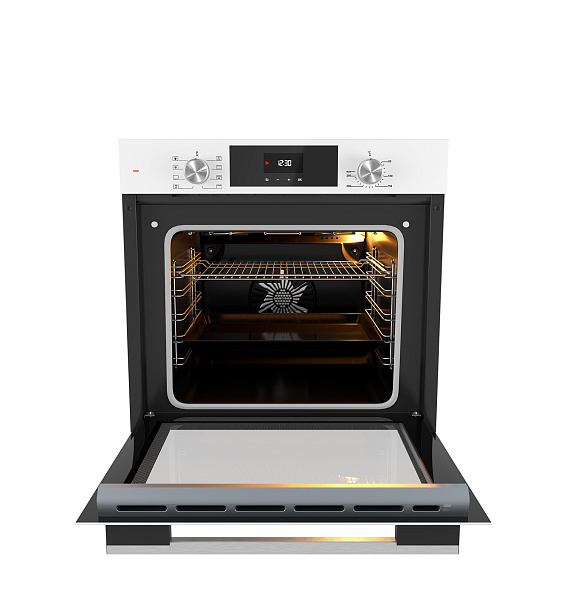 Всего можно выбрать несколько программ, задав оптимальную температуру и выставив время приготовления. Духовой шкаф оборудован специальным вентилятором, расположенным на задней стенке рабочей камеры. Он отвечает за эффективность работы конвекции, обеспечивая непрерывную циркуляцию воздуха внутри. Это позволяет равномерно пропекать блюда любой сложности до румяной корочки.