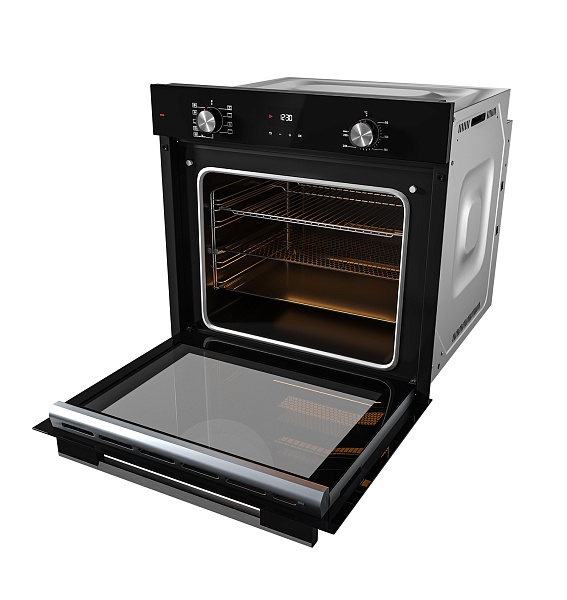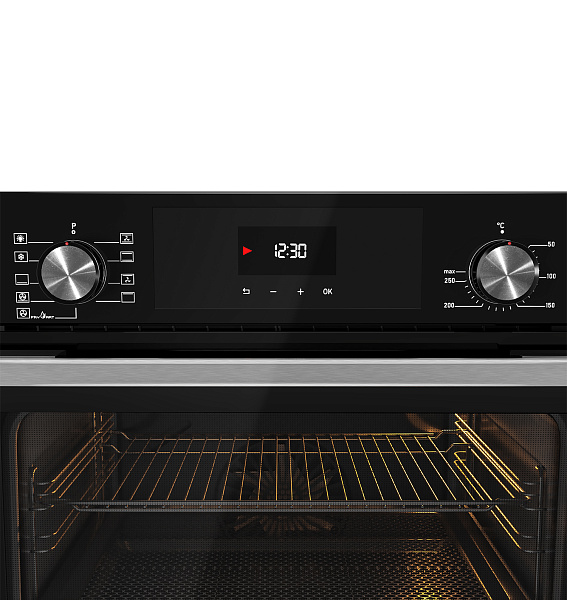 Выбор режима работы и температуры осуществляется с помощью утапливаемых в корпус вращающихся переключателей. Это существенно облегчает чистку поверхности устройства и предотвращает случайное изменение выставленных настроек. Вся актуальная информация в процессе приготовления отображается на LED-дисплее. Наличие подсветки внутри рабочей камеры, которая будет работать в любом режиме, дает возможность контролировать весь процесс приготовления, без необходимости постоянно открывать дверцу.