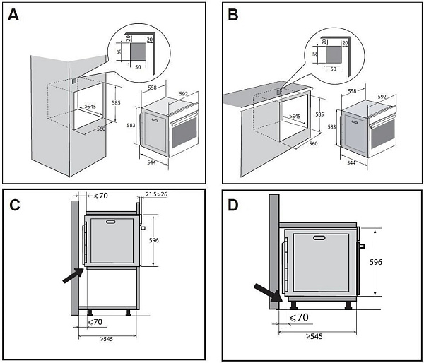 Особенности дизайна и внешней панели управления — также важный пункт при выборе духовки на кухню. В данной модели нужно обратить внимание на цвет — черный, охлаждение двери, чтобы поверхность и мебель вокруг не нагревались.