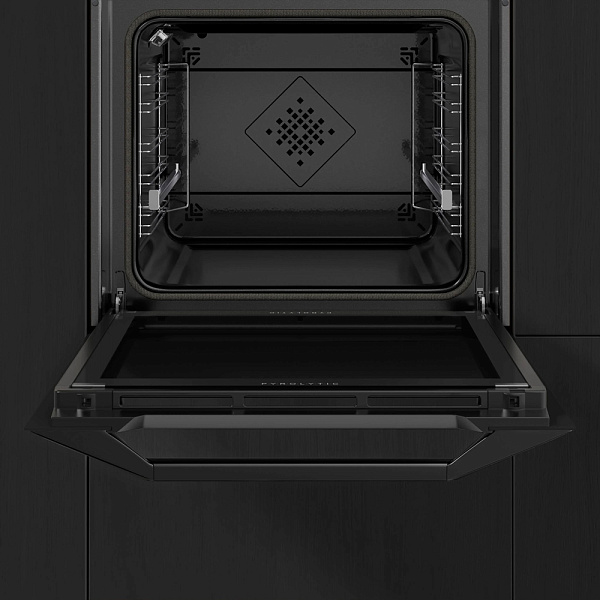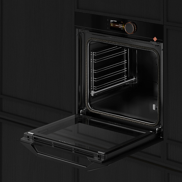 Особенности дизайна и внешней панели управления — также важный пункт при выборе духовки на кухню. В данной модели нужно обратить внимание на цвет — черный, охлаждение двери, чтобы поверхность и мебель вокруг не нагревались.