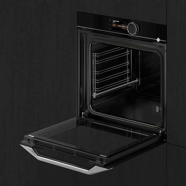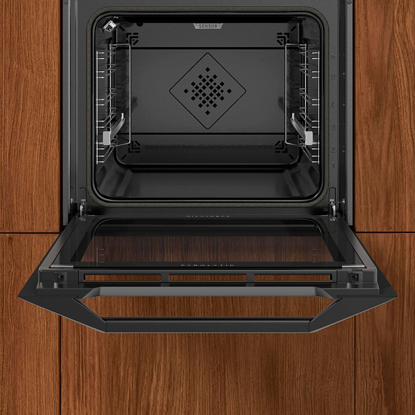 Особенности дизайна и внешней панели управления — также важный пункт при выборе духовки на кухню. В данной модели нужно обратить внимание на цвет — черный, охлаждение двери, чтобы поверхность и мебель вокруг не нагревались.