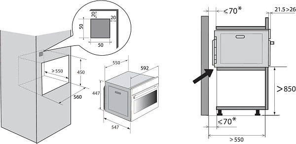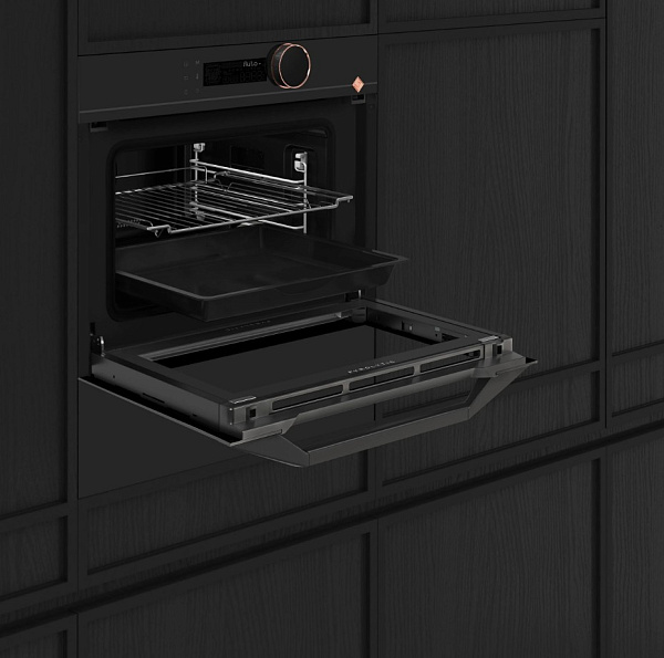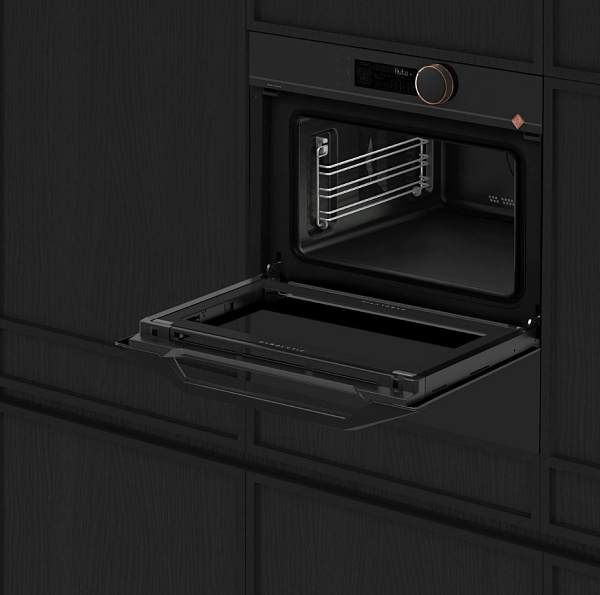 Особенности дизайна и внешней панели управления — также важный пункт при выборе духовки на кухню. В данной модели нужно обратить внимание на цвет — черный, охлаждение двери, чтобы поверхность и мебель вокруг не нагревались.