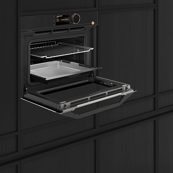 Особенности дизайна и внешней панели управления — также важный пункт при выборе духовки на кухню. В данной модели нужно обратить внимание на цвет — черный, охлаждение двери, чтобы поверхность и мебель вокруг не нагревались.