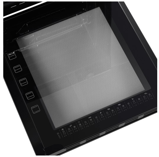 Трамп-линии нанесены на внутреннем стекле для создания эффекта непрозрачности фасада: при выключенном освещении не видно посуду, находящуюся внутри духовой камеры, а при включенном освещении можно в деталях рассмотреть весь процесс готовки.