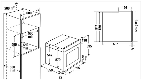 Объём духовки — 70 литров, что позволяет готовить как повседневные блюда, так и угощения для гостей. Съемная дверца, мягкое открытие и доводчик обеспечивают комфорт при использовании, а габариты 595×595×559 мм делают установку простой и универсальной.