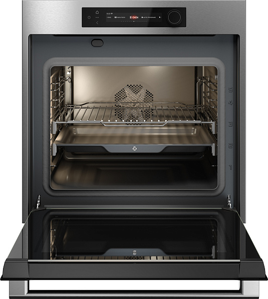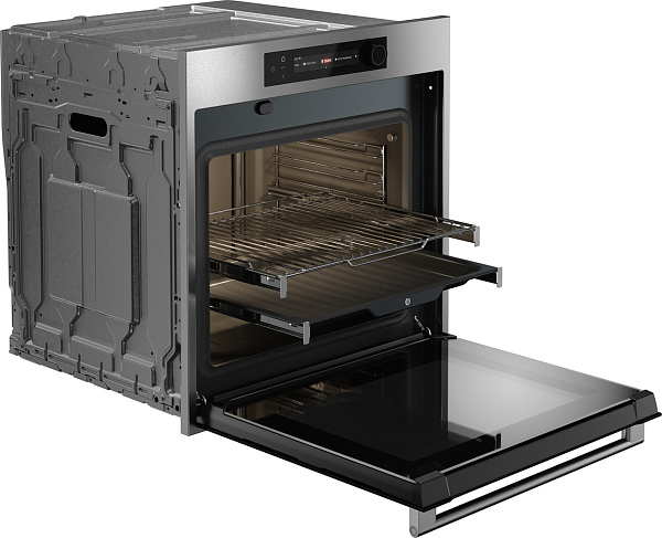 Внутри установлены полностью выдвижные телескопические направляющие на двух уровнях, что делает использование противней удобным и безопасным. Также предусмотрен термощуп для мяса, позволяющий точно контролировать степень прожарки.