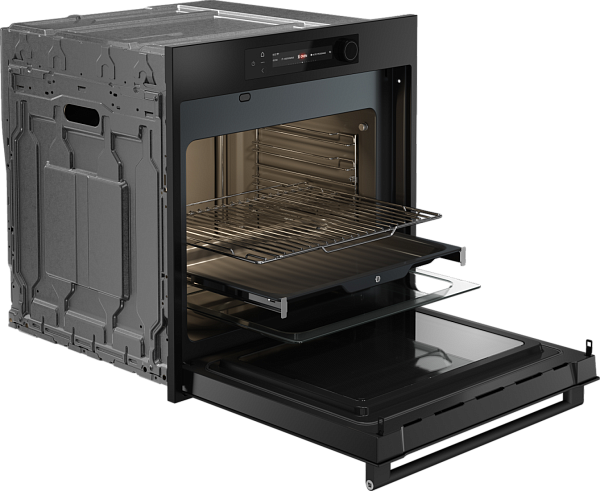 Система Celsius°Cooking позволяет контролировать температуру с точностью до одного градуса, обеспечивая профессиональный уровень приготовления. Встроенные телескопические направляющие на одном уровне делают использование противней удобным и безопасным.