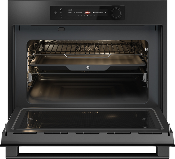 OCM64GSH предлагает 11 режимов нагрева, включая горячий воздух, гриль, AirFry, комбинированные режимы с микроволнами, пошаговое приготовление и размораживание. Внутри предусмотрены телескопические направляющие на одном уровне, а также премиальная боковая подсветка, обеспечивающая отличную видимость.