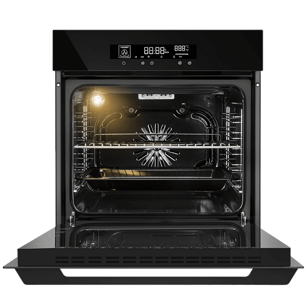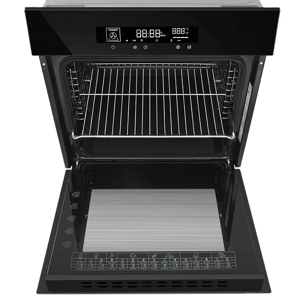 Стандартные размеры и объем в 60 литров позволяют легко встроить духовой шкаф в большинство кухонных гарнитуров и готовить крупные порции или несколько блюд одновременно.