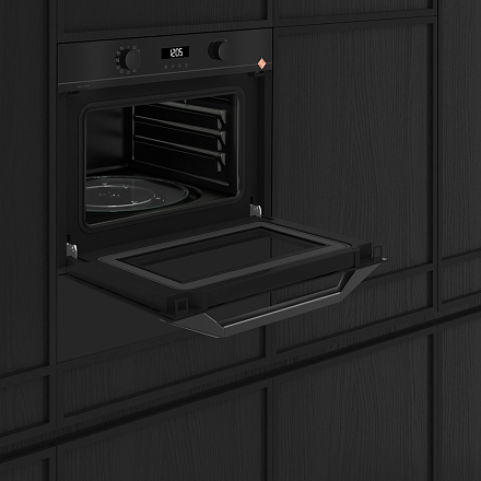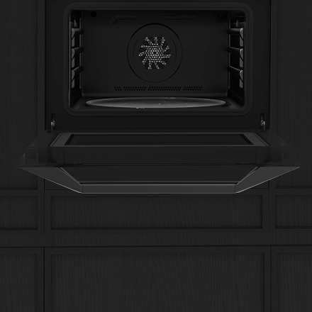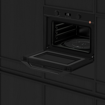 Диаметр съемной вращающейся подставки составляет 36 см, что упрощает размещение посуды различных размеров. Внутреннее покрытие камеры выполнено из эмали, что обеспечивает легкость очистки и устойчивость к износу. Кроме того, освещение внутри камеры позволяет контролировать процесс приготовления.